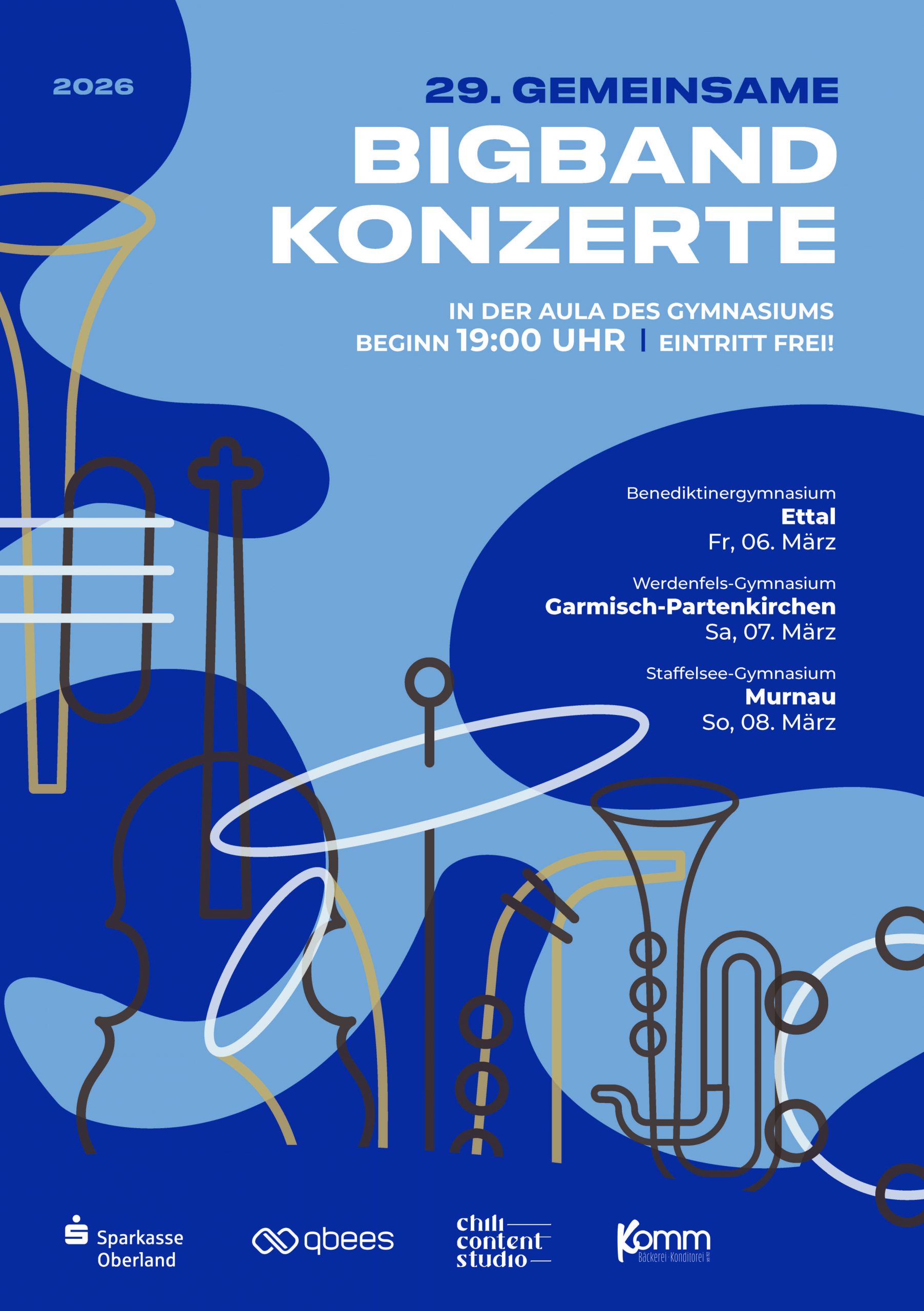 Musikbegeisterte aufgepasst! Die Big-Band des Benediktinergymnasiums Ettal freut sich, die diesjährige Big-Band-Konzertreihe 2026 bekannt zu geben. Gemeinsam mit den Big-Bands des Werdenfels-Gymnasiums Garmisch-Partenkirchen und des Staffelsee-Gymnasiums Murnau laden wir zu drei unvergesslichen Konzertabenden ein.