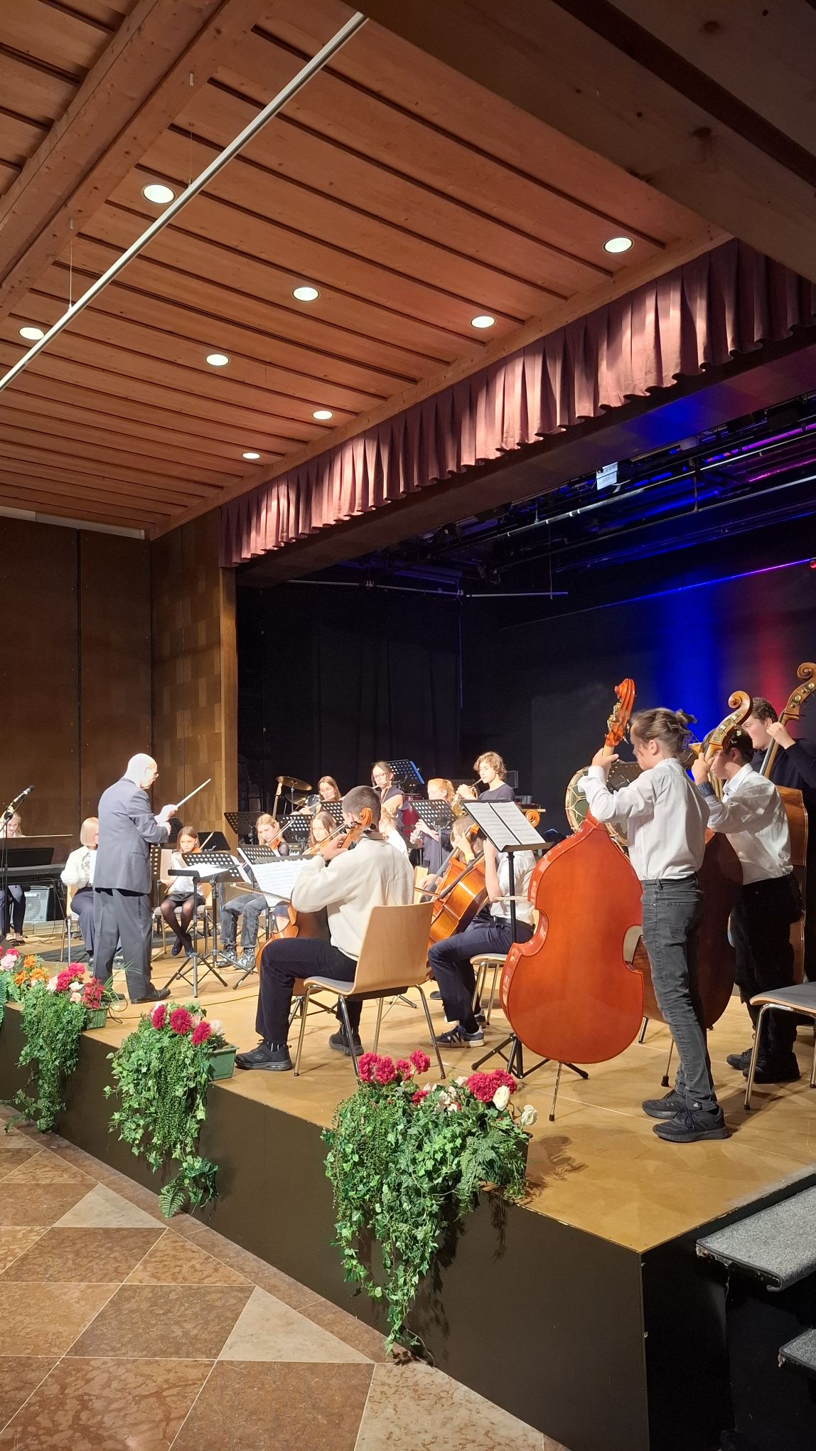 Ein Orchester, hauptsächlich bestehend aus jungen Musikern, spielt auf einer erhöhten Bühne in einem Konzertsaal. Ein älterer Dirigent steht mit Taktstock vorne links, dem Orchester zugewandt. Die Musiker spielen verschiedene Instrumente, darunter deutlich erkennbare Celli, Kontrabässe und Violinen; im Hintergrund sind auch Blasinstrumente und Schlagzeug zu sehen. Die Bühne hat einen hellen Holzboden und eine dunkle Rückwand, die von blauen und roten Scheinwerfern beleuchtet wird. Darüber hängt ein dunkelroter Vorhang. Die Decke des Saals ist aus hellem Holz und mit runden Einbauleuchten versehen. Der vordere Rand der Bühne ist mit grünen Hängepflanzen und roten Blumen dekoriert. Der Boden vor der Bühne ist mit quadratischen, gemusterten Fliesen bedeckt.