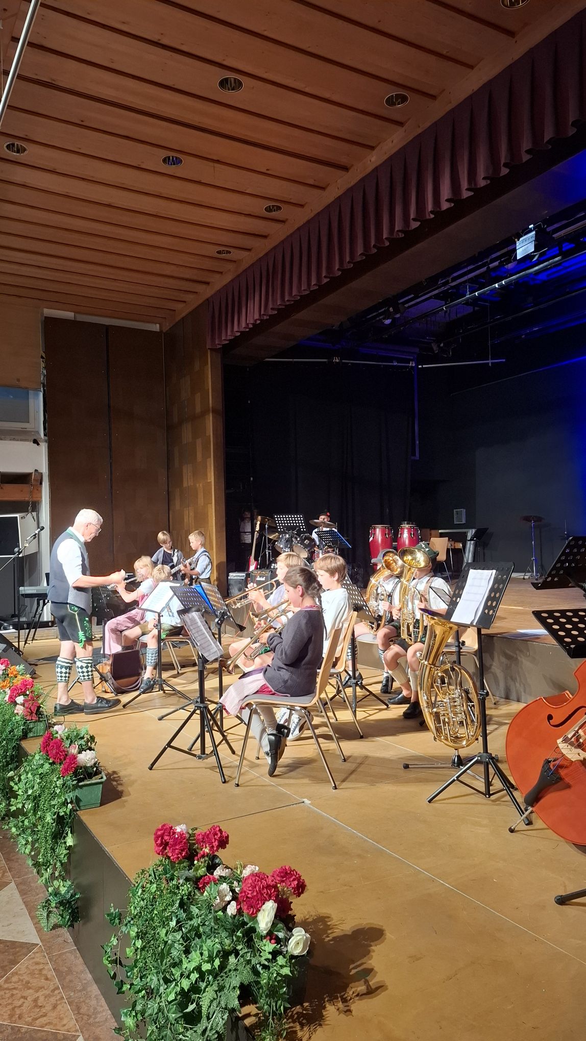 Eine Gruppe von Kindern, ein Jugendorchester, spielt auf einer hölzernen Bühne. Ein älterer Mann in traditioneller Tracht steht links im Vordergrund und leitet die Gruppe. Mehrere Kinder sitzen und spielen Blechblasinstrumente wie Tuben, Trompeten und Posaunen; einige tragen ebenfalls Tracht, darunter Lederhosen und gemusterte Socken. Im Hintergrund sind weitere Instrumente wie ein Schlagzeug, Congas und eine Gitarre zu sehen. Notenständer stehen vor den Musikern. Rechts im Vordergrund lehnt der Korpus eines Kontrabasses. Am vorderen Bühnenrand sind Blumen und Grünpflanzen arrangiert. Der Bühnenhintergrund ist dunkel, mit blauer Beleuchtung rechts. Über der Bühne sind dunkelrote Vorhänge und eine Holzdecke mit runden Einbauleuchten sichtbar.