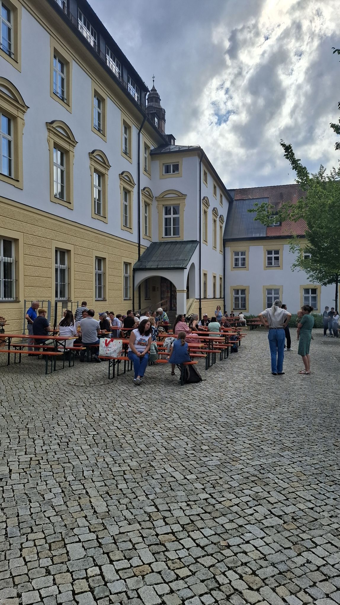 Belebter Innenhof unter bewölktem Himmel. Zahlreiche Menschen sitzen an langen Tischen mit roten Platten und Bänken oder stehen in Gruppen. Der Boden ist mit Kopfsteinpflaster ausgelegt. Im Hintergrund sind helle Gebäude mit gelben Akzenten und ein Turm mit Kreuz zu sehen.