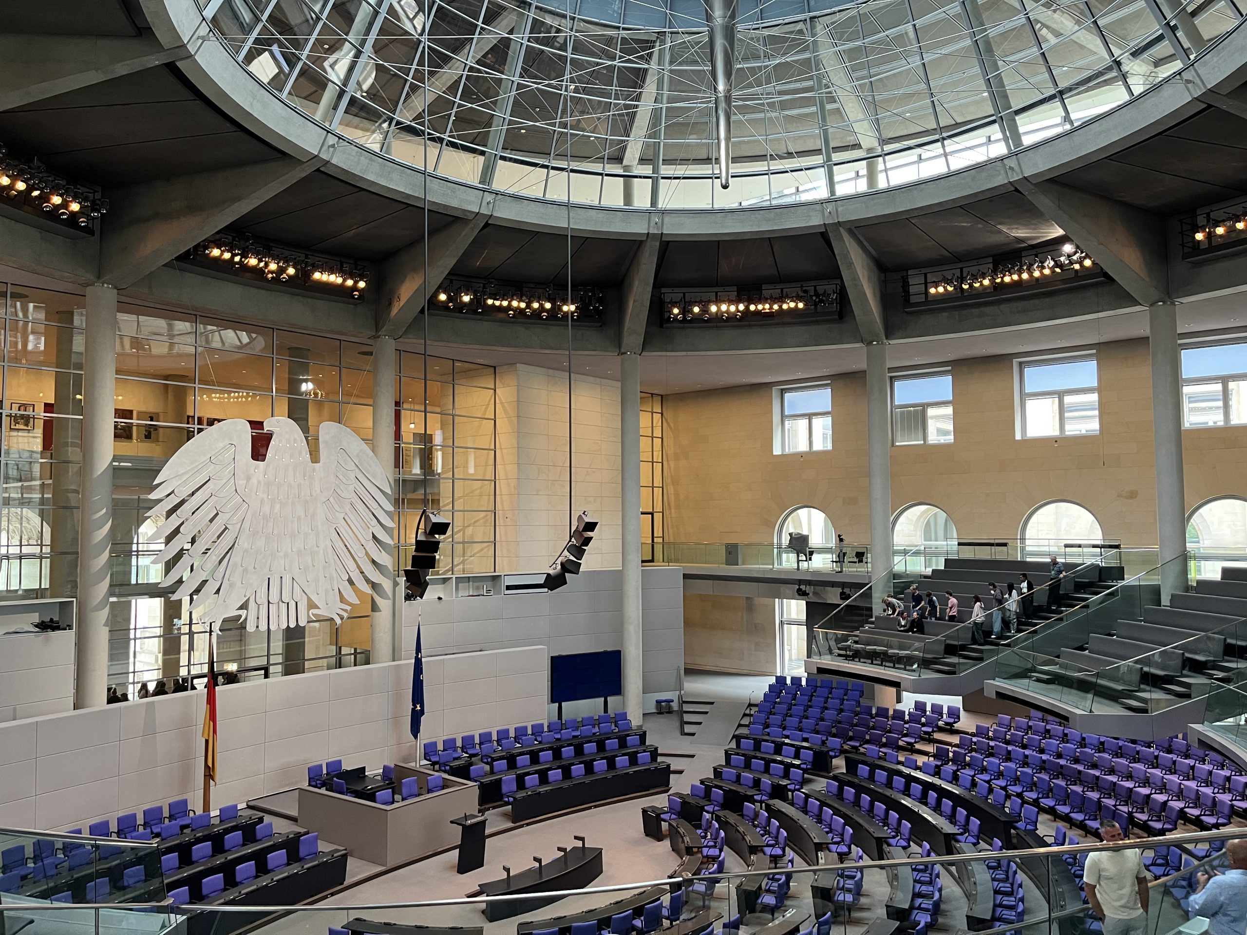 Links im Vordergrund steht eine große, stilisierte weiße Adlerfigur. Daneben sind eine deutsche Flagge und eine Europäische Union-Flagge zu sehen. Die oberen Wände sind mit hellen Steinplatten verkleidet und haben große rechteckige und gerundete Fenster. Besucher bewegen sich auf Treppen und Aussichtsplattformen mit Glasgeländern.